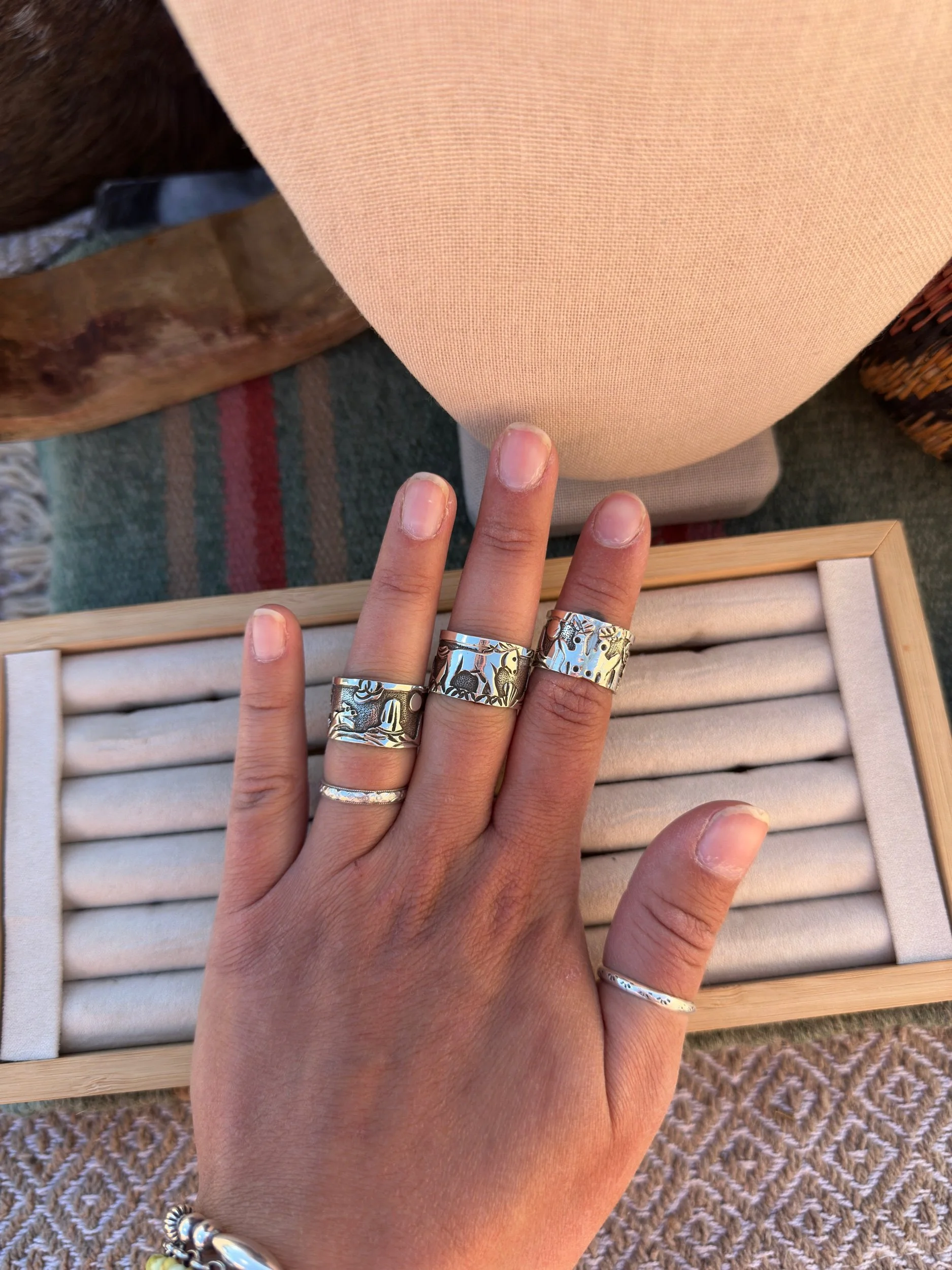 -I suggest sizing up 1- 1 1/2 sizes due to the thick band. (1/2” wide)