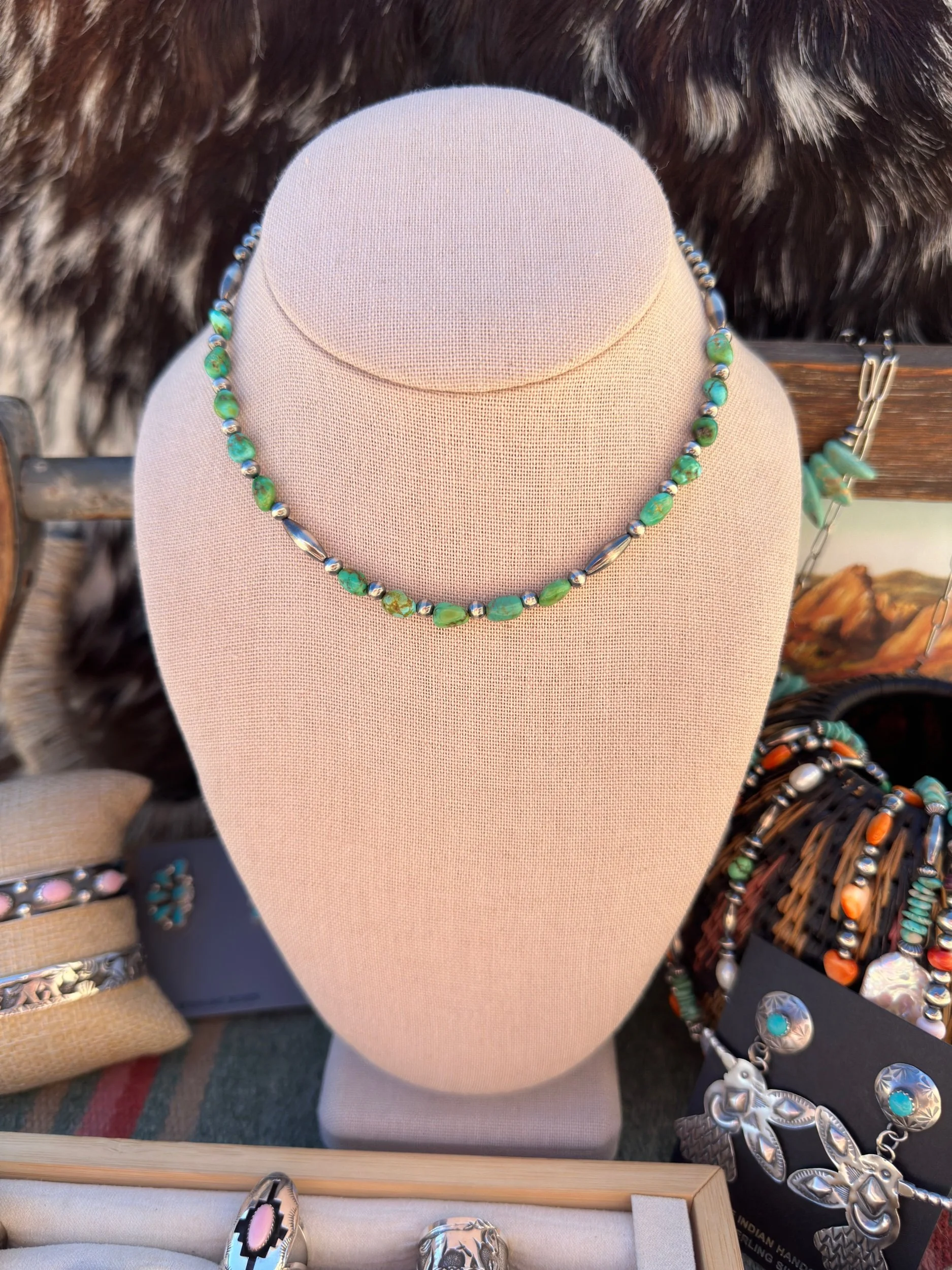 -Golden Hills Turquoise is extremely hard to get my hands on as the mine is only operable in the winter months. Due to the rarity of this turquoise it is on the pricy side of turquoise.